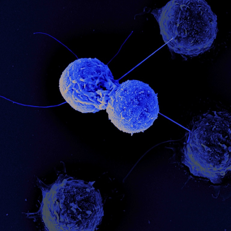 The image displays a leukemia cell undergoing cell division. During this process, a large cell is constricted in the middle of the cell, forming a cleavage that closes until the two resulting sister cells are separated. All the structures seen in this image are folds of the plasma membrane, which is the surface layer of the cell. Our research investigates how these folds form and unfold at different locations on the cell surface as the cell divides, and how this impacts the fidelity of cell division.