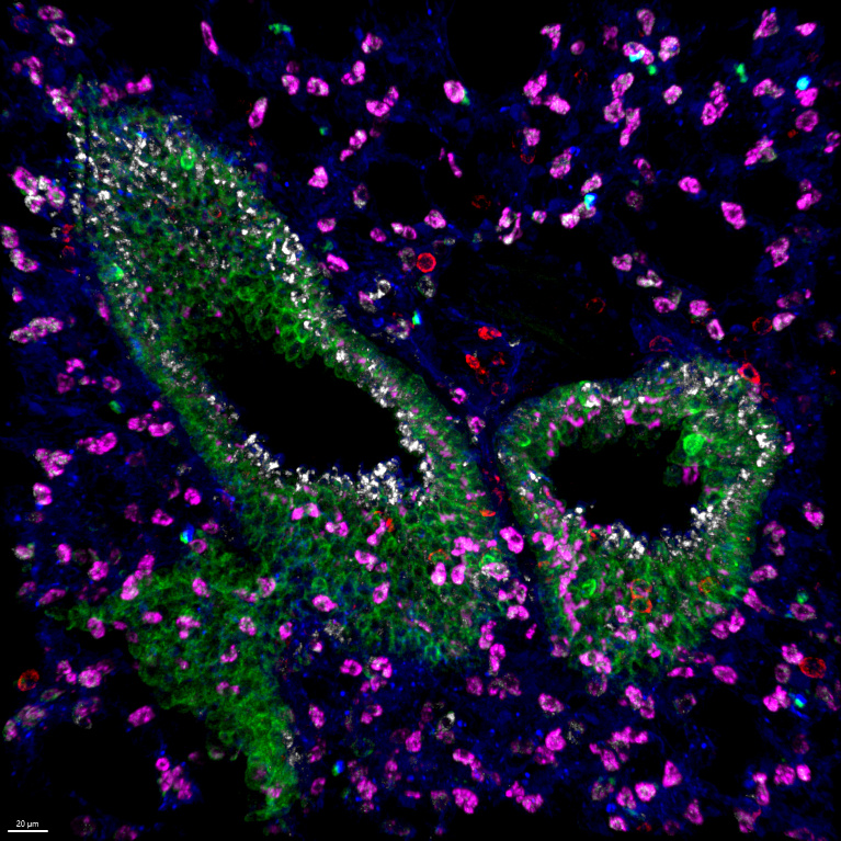 Even in the absence of infection, the lung is awash in immune cells that play a vital role in protecting the host from airborne pathogens. This image shows some of these cells dispersed throughout a three-dimensional cross-section of a mouse lung.