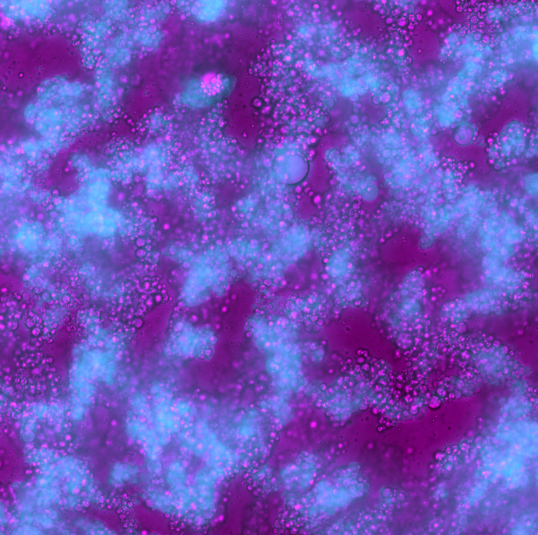 This image taken is an imaging ‘phantom’ or synthetic tissue used to calibrate magnetic resonance imaging instruments (MRIs). Phantoms are critical tools for developing medical imaging techniques when it is less feasible to use human subjects. The Cima Lab in the Koch Institute is developing a portable magnetic resonance (MR) device. The device is being tested for use to detect fluid status in patients in both in-patient and out-patient clinical settings. The phantom consists of an oil in water emulsion, it took a significant amount of time, error, and experimentation to develop the correct procedure.