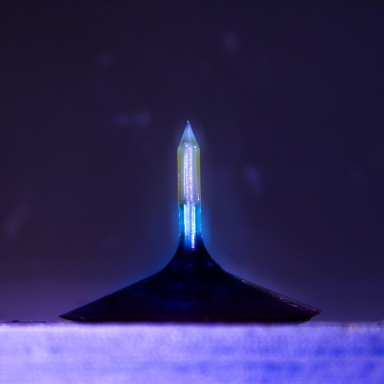 Researchers in the Jaklenec and Langer lab are working to deliver multiple vaccine doses in one injection, eliminating the need for repeat clinic visits for boosters, which is especially beneficial in developing countries where many do not receive complete vaccinations. Shown is an injectable and implantable needle made of fully dissolvable materials, designed to deliver two doses of mRNA vaccine at programmed intervals. The first dose is loaded at the needle tip and second is encapsulated in a slow degrading polymer capsule programmed to release its cargo at certain time points. Inspecting the prototypes with a microscope and reviewing images like these help the researchers confirm that different materials successfully ended up at their intended locations.
