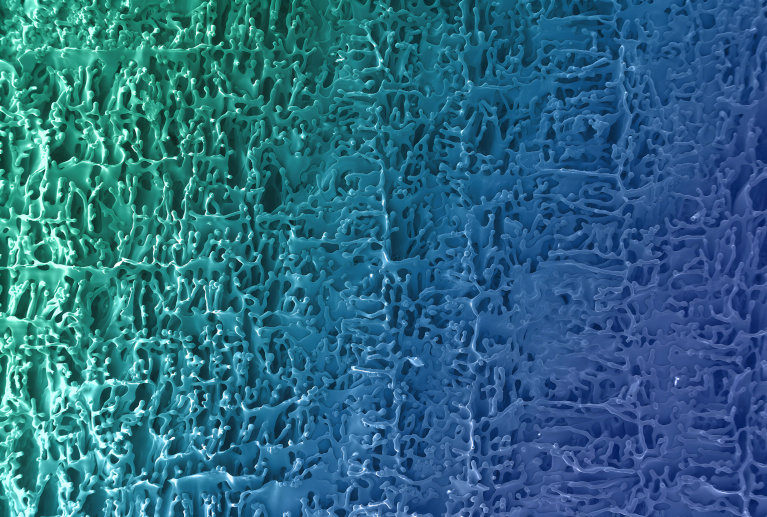 The Anderson Lab is developing new materials platforms for long-term implantable cell therapies. Current technologies are limited to low densities of cells within the implant, as crowded cells to compete for nutrients and devices must be impractically large to encapsulate therapeutically relevant cell populations. The lab’s new microscale sponge material shown here aims to tackle this challenge by providing plenty of empty space for cells to grow in, thus enhancing the oxygenation of cell constructs and creating a coral reef-like environment for cells to thrive in and extend the life of living implants.