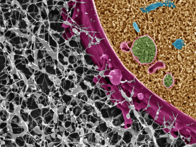 A black and white image of a fine, spongy lattice with section of a circular brown grainy structure with a pink boundary at the top right corner