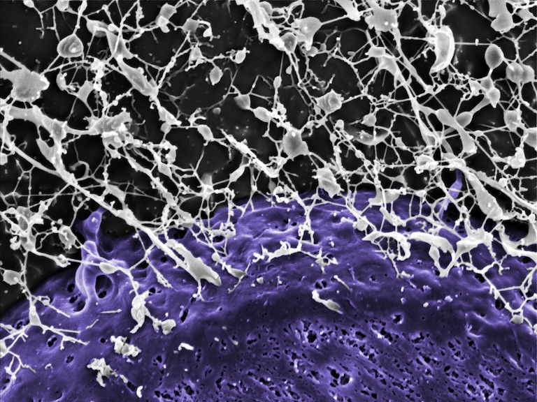 An image of a fine, spongy grey lattice with a section of a violet circular structure at the bottom