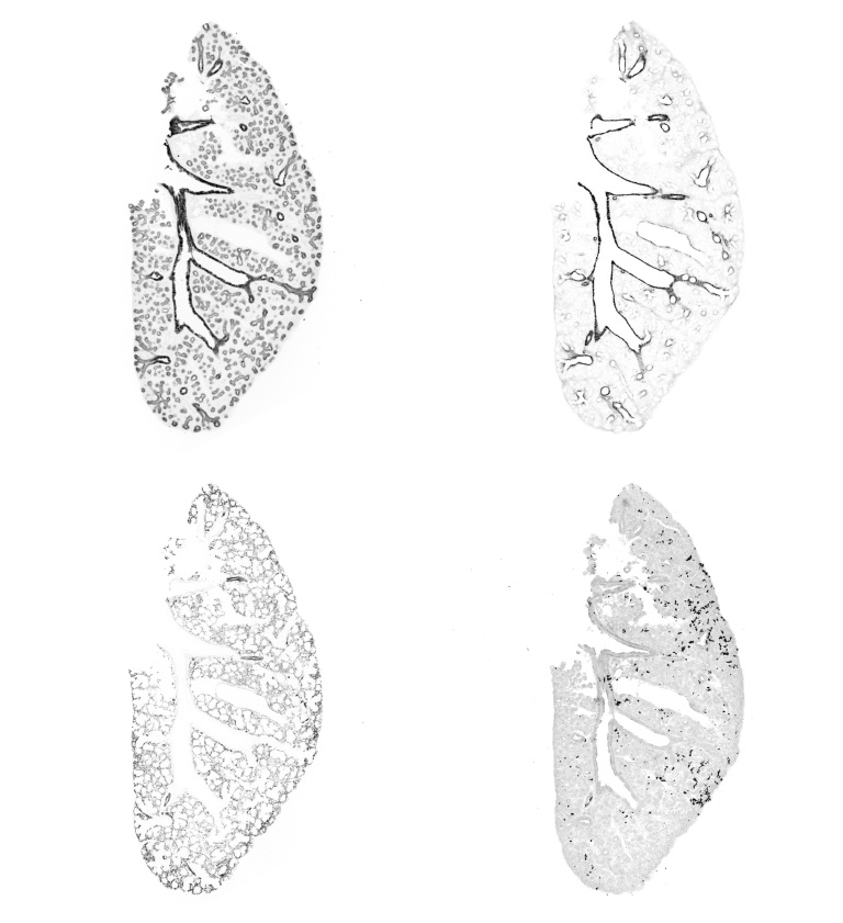 Here we see antibody staining of a lineage tracing experiment to look at the fate of progenitor cells labelled prior to organ development. Clonal relationships and cell fate decisions can be inferred by looking for expression of cell type markers such as PECAM for endothelial cells and ACTA2 for smooth muscle.