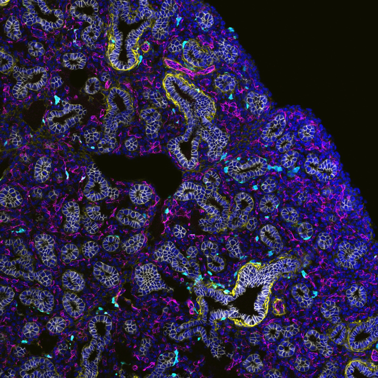 Here we see antibody staining of a lineage tracing experiment to look at the fate of progenitor cells labelled prior to organ development. Progeny of labeled progenitor cells can be seen by expression of a reporter (shown in cyan). Clonal relationships and cell fate decisions can be inferred by looking for expression of cell type markers such as PECAM for endothelial cells and ACTA2 for smooth muscle.