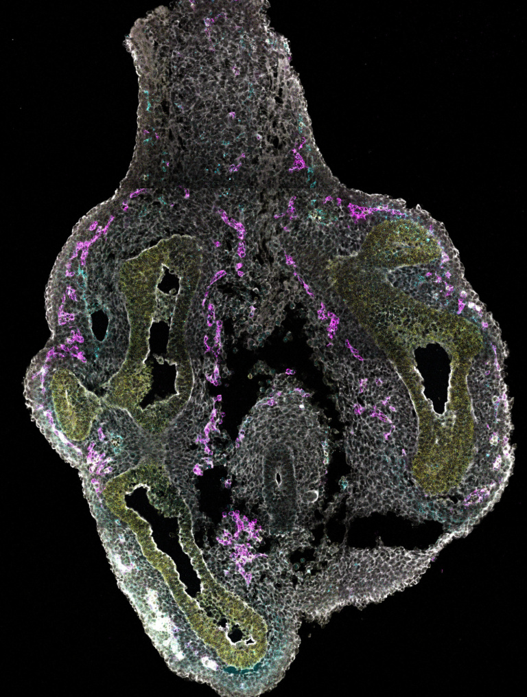 Here we are looking at the distribution of progenitor (cyan) and differentiated (magenta) endothelial cells in the embryonic mouse lung