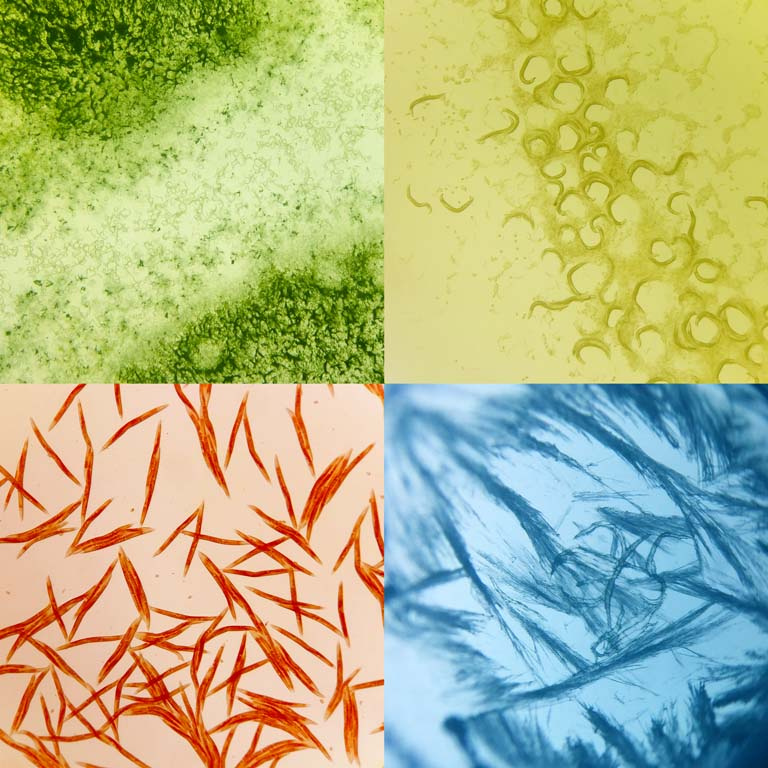 As I have sat at my microscope watching the seasons change just outside the lab windows, so too do various images of worms under my microscope evoke and mirror the feeling of the seasons (the greenery of spring, sandy beaches of summer, falling leaves of autumn and icy cold of winter). These are pictures of C. elegans, a transparent nematode worm that we have studied and used to uncover many biological processes. The small size and transparency of C. elegans allows for easy visual observation of its physiological processes, morphology and behavior.